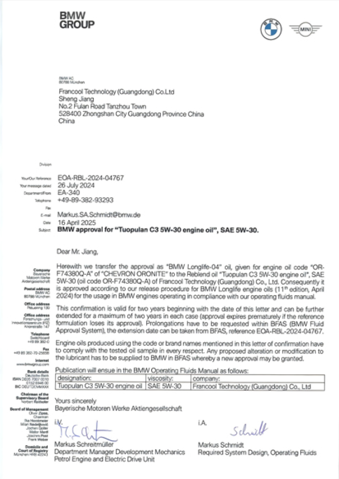 OEM Mercedes-Benz & BMW Group Approval References — Documented Formulation Approvals