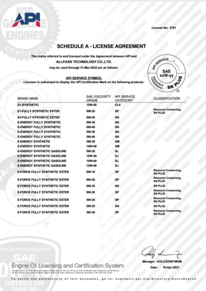 ✔API Licensed Engine Oil Categories (SP / SN)