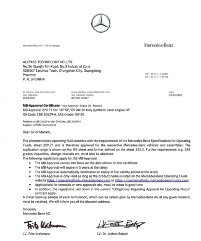 Selected Become Lubricant formulations are supported by documented Mercedes-Benz MB-Approval 229.71 operating fluid approval references, issued under the Mercedes-Benz approval system for qualifying engine oil formulations